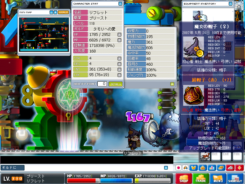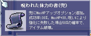 HP考察 頭編 Category:めいぽ/考察 Date:2007年05月16日 聖魔はレベが上がってくるとHPを強化することが多くなると思います聖魔はヒールでHP回復できるために MGが切れればほぼ黒字になりますまた物理、魔法ともに軽減スキルがあるために強化のハードルが低いですさてその素材となるものですがこの2つがよく強化されるものですかねピグバンドが理想ですが 結構値が張るので素材が無い場合 メルが無い場合などは運動帽でもいいかもしれませんねさて これらに張る書は HPを強化する書=体力の書 なのですが大雑把に分けると2種類ありますまずは 普通の書この書は 100% 60% 10% の3種類の成功率があります効果はHPを +5 +10 +30次に 呪いの書この書は2種類 70% 30% の2種類があります効果はHPを +10 +30画像にあるように 失敗時50%の確立で物がなくなります余談ですが基本的に 普通の書がある=70%の効果は薄いですさてさて 強化についての考察は基本的に運ですので素材についての考察をしますねダメージに耐えるためには2種類の方法があるんですよまず1つは ↑でも書きましたが HPを強化する方法ですねもう1つは 被ダメ自体を減らす方法ですさてそれでは実験運動帽装備 防御148大体の被ダメは1190ですね続いては こちら絹帽子装備 防御195だいたいの被ダメは1170ですね防御を47上げることによって最大ダメージがだいたい20違いますねつまり絹帽子は+20のHP強化してあるのと同じことになりますINTもついてますし 魔専用の防具も捨てたものではありませんですが いくつか問題もありますそれは絹帽子にはLUKが必要ですからLUKが足りないと装備する事ができませんまた 魔でしか使えないので 他職との使い回しができません結論から言えば 純粋にHPを強化するならピグバンドがお勧めですねですが もしLUKをある程度振っているならばINTがついていて 防御が高い魔用の帽子強化っていう手もあるという事です私はINTを重視して 魔用帽子強化にしました最後に 防御強化の書もあるにはあるんですが防御の上昇値が低いため 十分な効果が得られませんなので強化する場合は体力強化をするべきだと思いますね iPhoneゲーム・攻略ブログ・ランキング 最近書いた記事 PR