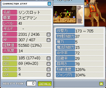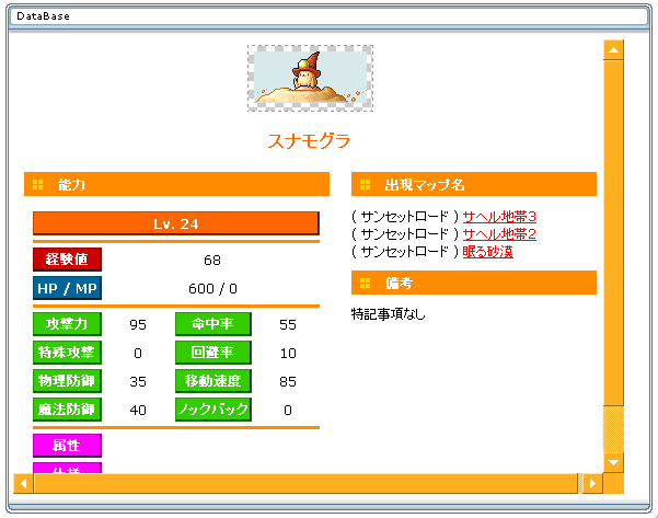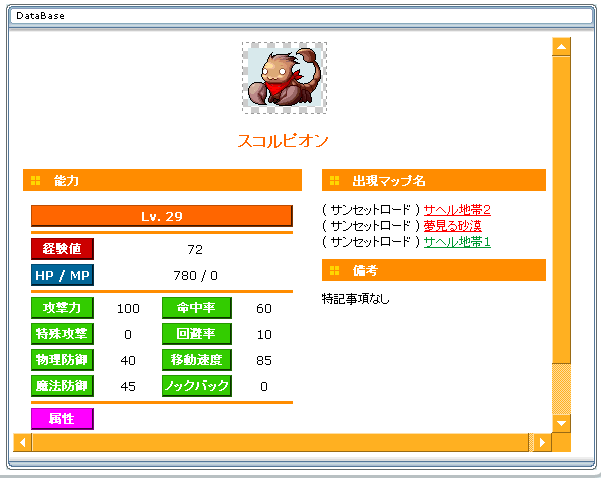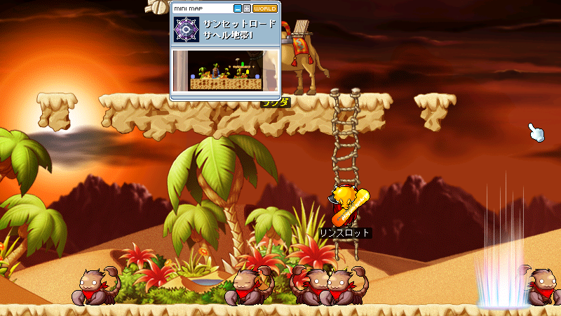 サヘル地帯1 Category:狩場考察 Date:2007年11月06日 私が32レベルから狩っていたサヘル地帯について書きたいと思います32レベルの時はサヘル地帯3で狩っていたのですがサヘル地帯3~1はマップが似たような感じなので一番効率が良いと思われるサヘル地帯1の事を書きたいと思いますそれに3~2で狩ることになるスナモグラからはレアドロップ確認できませんでしたからでも一応敵モンスターのデータを載せておきますモンスターデータはみらくる☆めいぷる様よりお借りしましたサヘル地帯1のマップ構成はこんな感じです上に一応足場があるのですが ここには敵は沸きませんこれは1~3すべて同じですw 一番下しか敵は沸きませんチャットがしたい時疲れた時などはロープに掴まれば良いのですごく楽です狩るモンスターはこちらスナモグラと経験値はほとんど変わらないですただスコルピオの方が攻撃力が高くHPも多いので20代前半で狩る場合はスナモグラの方が良いかもしれませんこの狩場の経験値はですね上記のステータスでブスタなしたこなし丸薬なしで時給250kは超えます(サクチケあり)マップがそんなに広くないし 沸きも良いので鴉が狩り難い職はここで狩ったほうが良いです最後にレアドロップですが こんなものが出ました私はサヘル地帯を卒業するまでに2枚ドロップしましたwあとサヘル地帯で狩ってる時に片手剣10%を2枚ドロップしていたのでこちらはもしかしたらスナモグラがドロップしたのかもしれませんね以上でサヘル地帯の紹介を終わりにします iPhoneゲーム・攻略ブログ・ランキング 最近書いた記事 PR